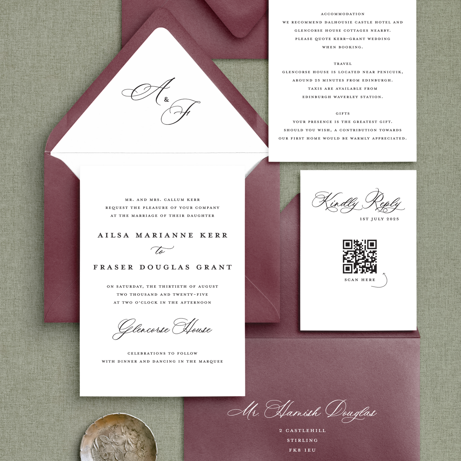 The Ailsa Suite is sleek and timeless, combining a crisp serif font with a modern handwritten script. The balance of clean structure and graceful flourishes makes this design versatile- equally at home in a grand castle setting or a chic, contemporary space. With endless opportunities for personalisation, Ailsa offers a classic yet modern foundation for your wedding stationery.
