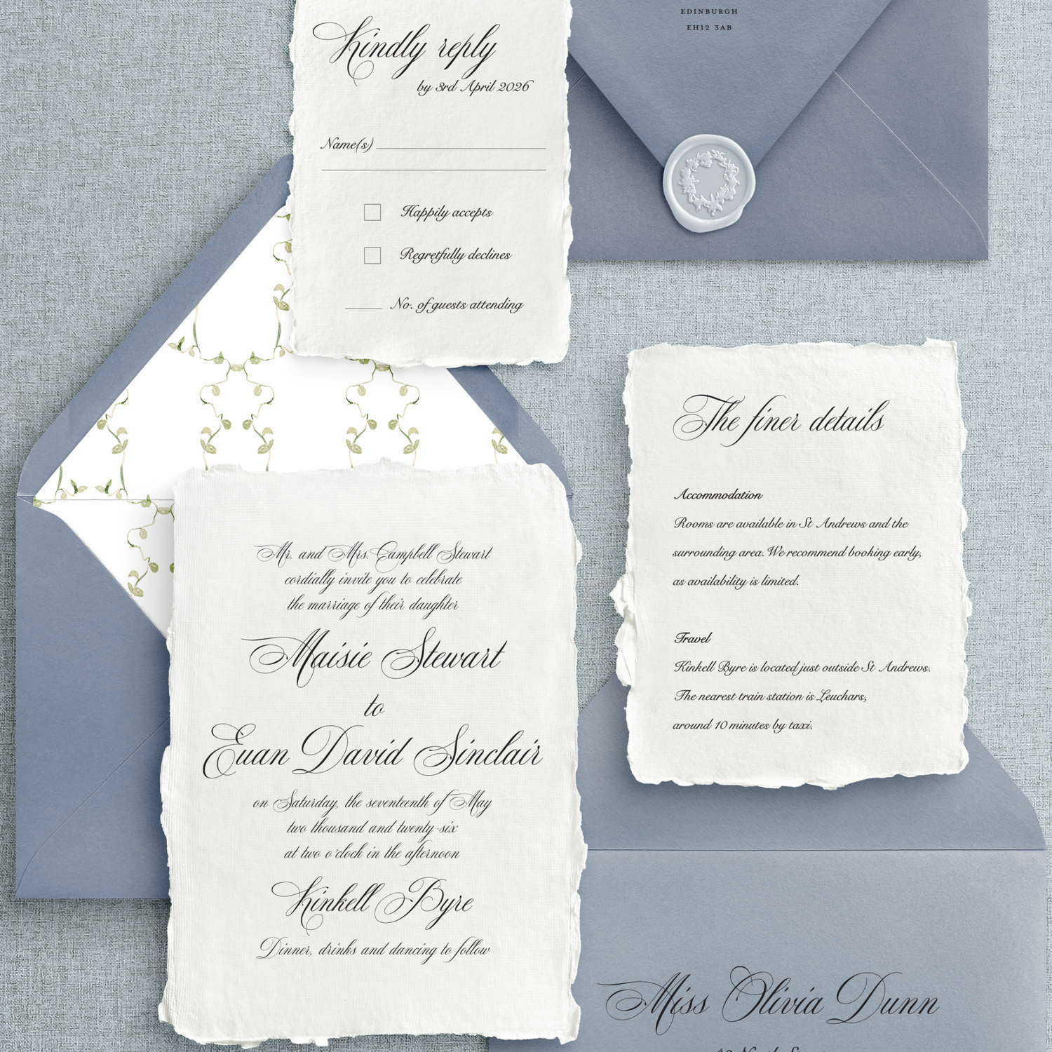 The Maisie Suite is romantic and timeless, combining elegant script with a refined serif on beautifully textured handmade paper. The sweeping calligraphy brings movement and charm, while the serif adds structure and balance- together creating a look that feels graceful and enduring. Perfect for rustic venues, barn celebrations, or heritage settings, Maisie pairs natural textures with elegant type for a suite full of personality.